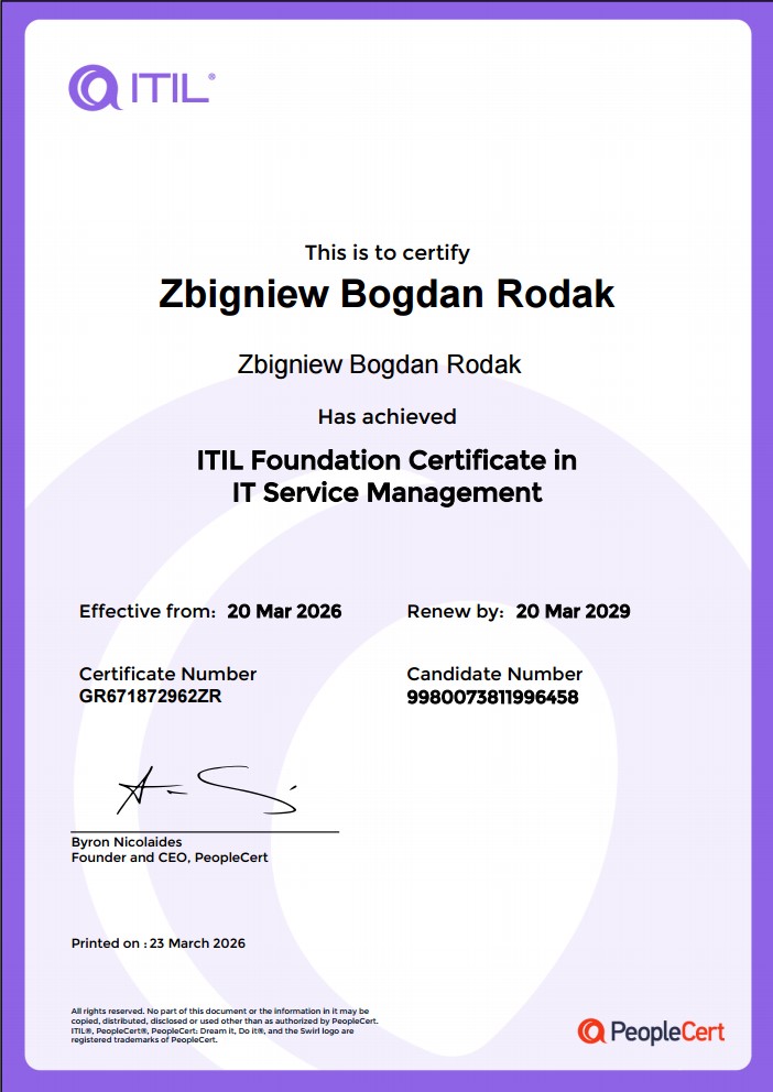 - Szkolenie i certyfikat ITIL 4.0 Foundation.
